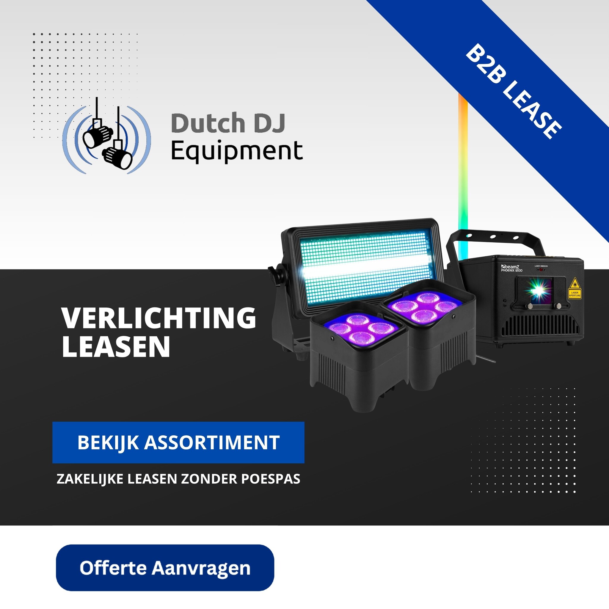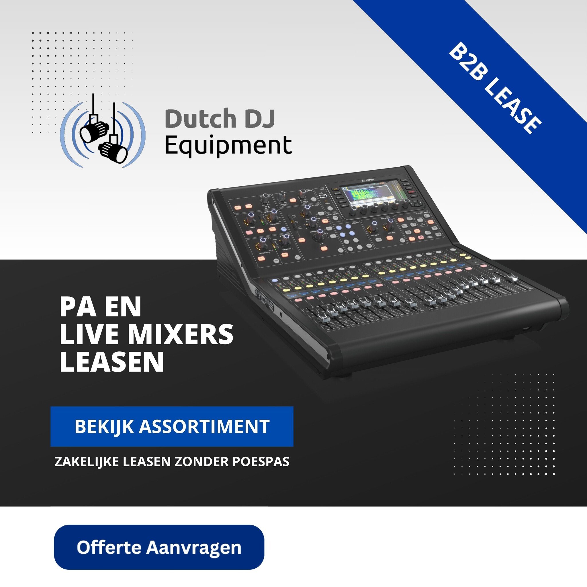 Altijd de nieuwste gear zonder grote investeringen? Dit is bij Dutch DJ Equipment mogelijk met onze zakelijke (operationele) lease. Dit type lease, ook wel huur/koop lease genoemd, stelt u in staat om apparatuur van de bank voor een vastgestelde periode met vaste maandlasten te huren. In principe is het mogelijk om alles te leasen orderwaarde vanaf €999 (exclusief btw); een compleet nieuwe DJset, geluidsset of mooie set movingheads, alles kan. U kunt kiezen uit verschillende looptijden van 15, 24, 36, 48, 60 of 72 maanden.